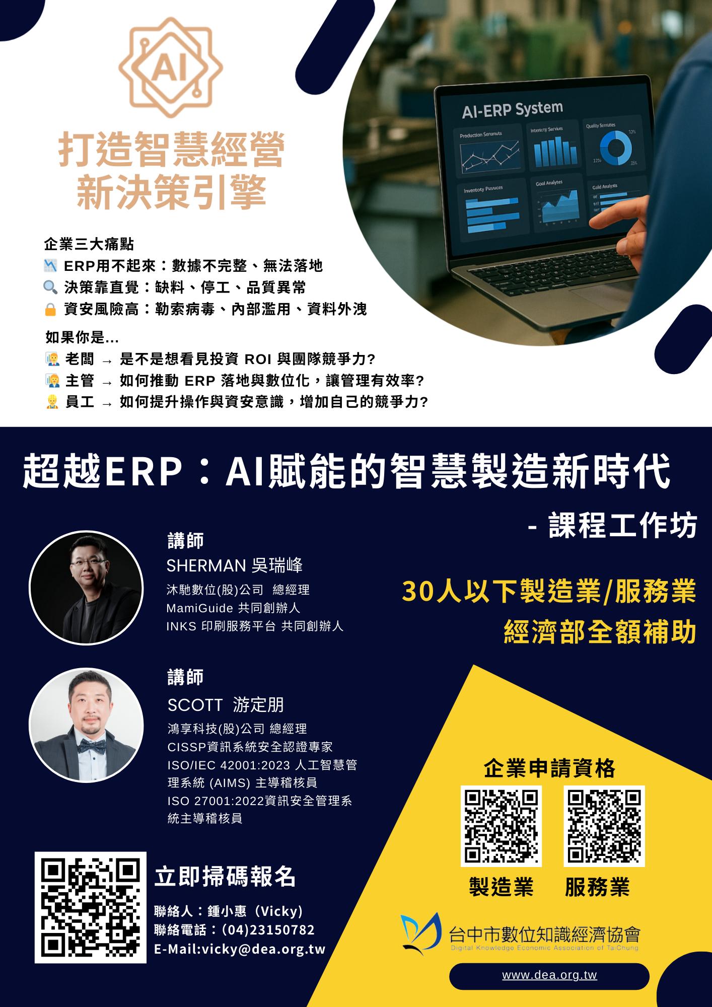 在製造業中,ERP 常被視為「紀錄系統」,但很少真正落地應用,更難成為決策引擎。本課程不再單純教授 ERP 操作,而是透過 AI 技術 × ERP 數據 × 資安保護 的三重架構,協助企業: